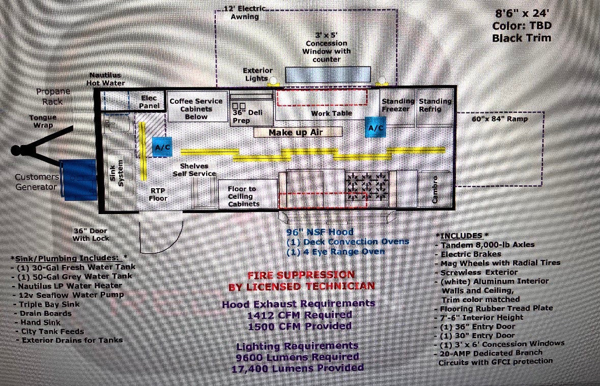 Built for comfort and compliance, the trailer includes front and rear air conditioning, insulated walls, stainless steel wall coverings, and diamond-plated non-slip aluminum flooring. Safety features include a 7-foot exhaust hood, 1500 CFM exhaust fan, fire extinguisher, and a Pyro-Chem PCL 350 professional fire suppression system.